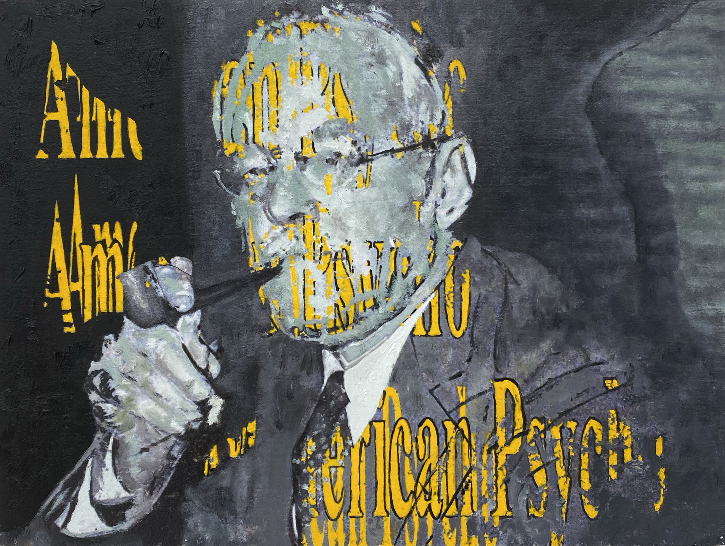 Acrylic paint, latex paint, inkjet transfer, pen, pencil, shellac on wood panel