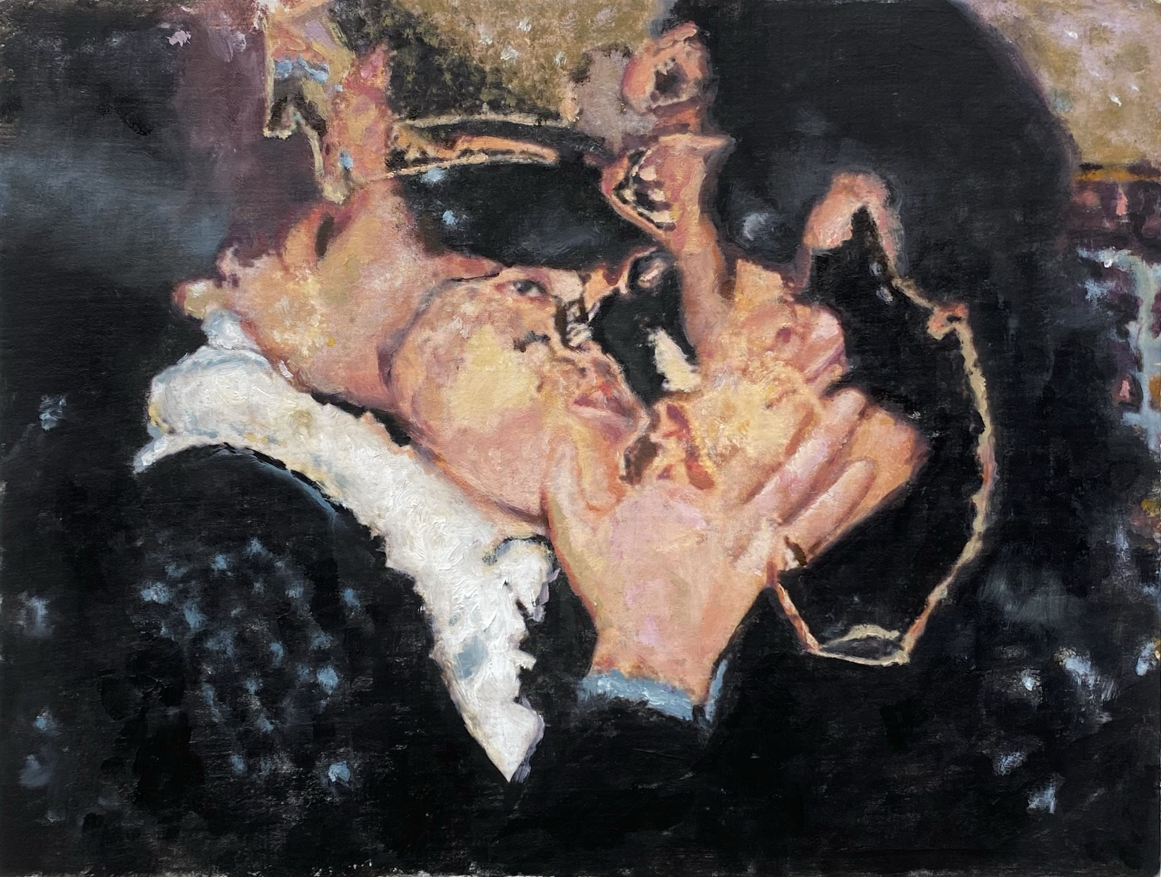 Acrylic, pencil, hand embroidered socks, shot glass, rye whiskey on artist's panel